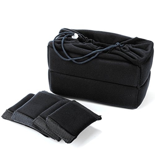 - El estuche con insertos separa el armazón de su cámara y sus lentes con otras pertenencias en su bolso o funda de viaje.